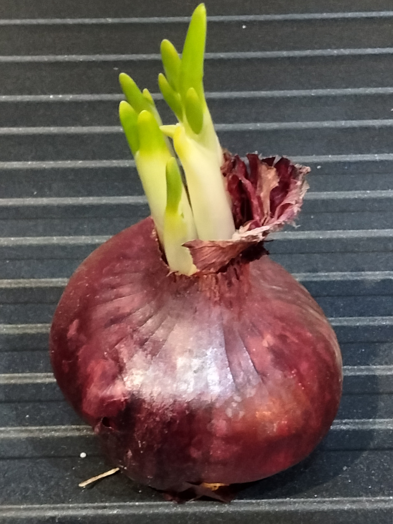 I found a red onion in the garage in my veg box. It was shop bought but long forgotten and was once as big as a fist. It has sprouted with FIVE distinct shoots each about two inches long.