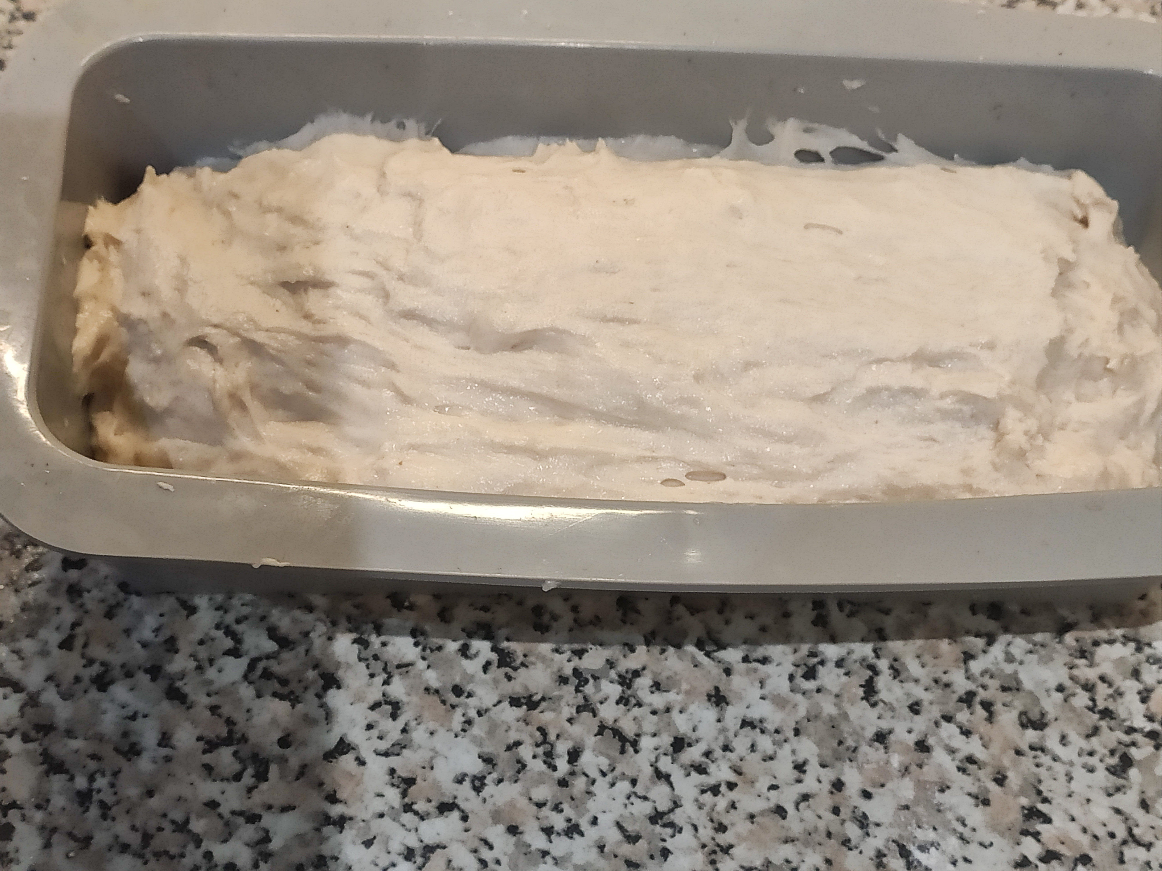 Flop it into a silicone or metal loaf tin. I used silicone and didn't grease it. Knead it a little to burst big bubbles.