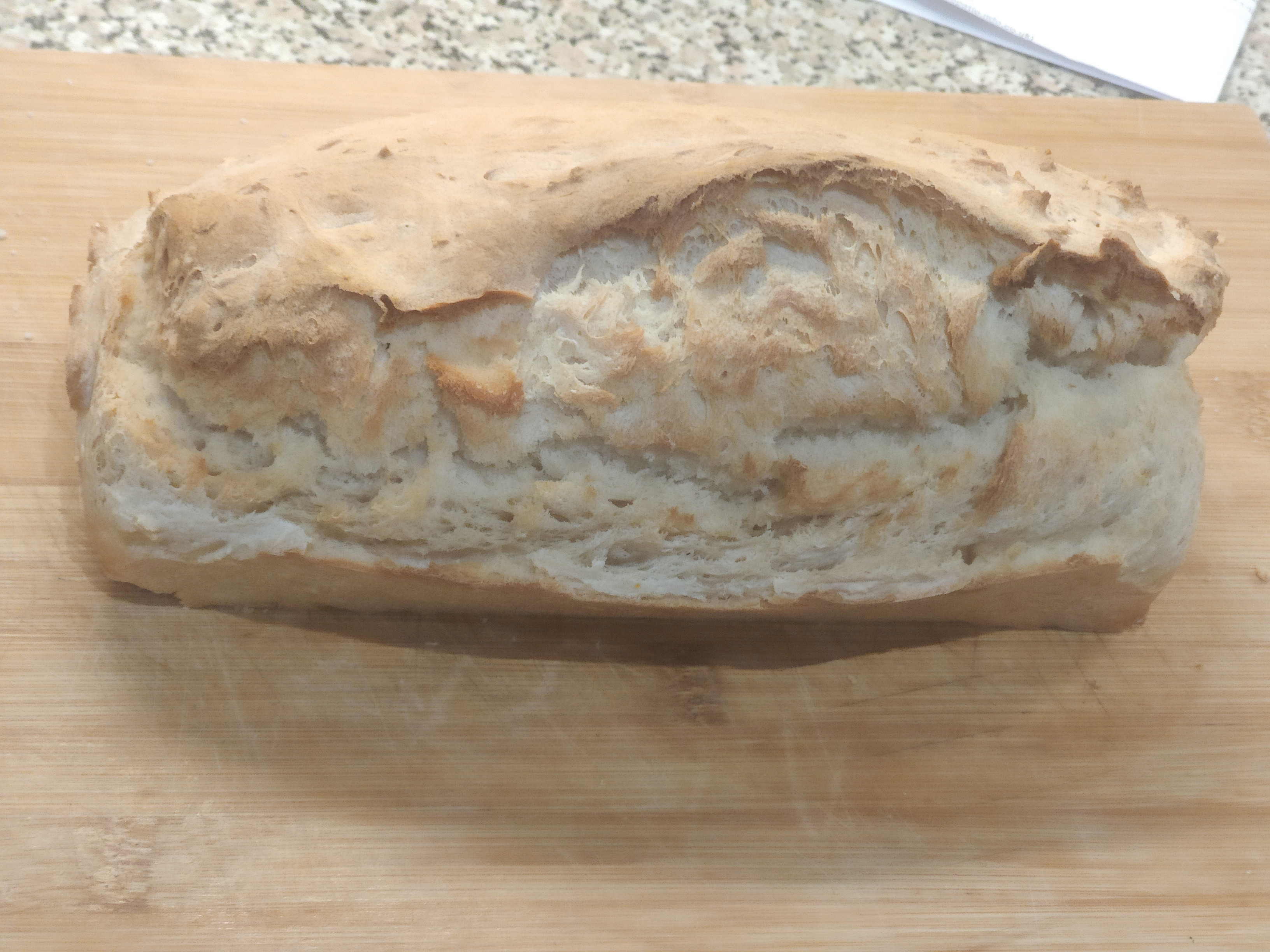 Cutting an end off revealed a somewhat doughy bread. It had the right amount of air bubbles.
