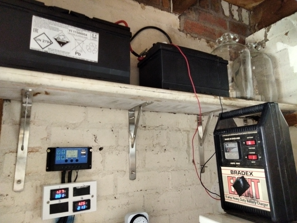 A simple mains timer powering an 8A battery charger, also by night so the batteries are nice and full by morning