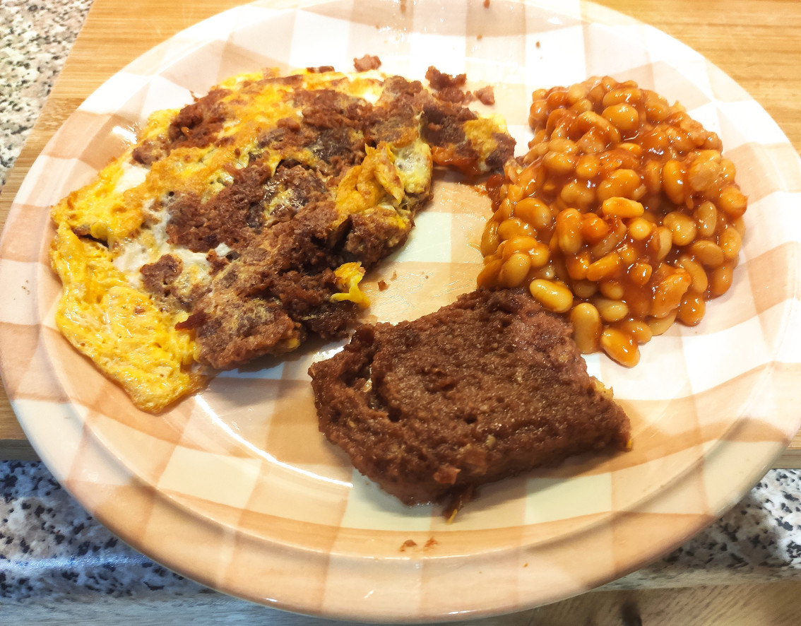 So I stirred in an egg and served with beans. Daftest fry up I ever had. Still . A generous portion of protein.