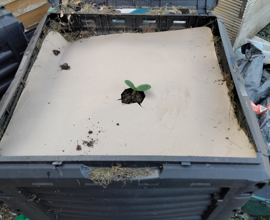 Am I being silly? The idea is to get two free crops while my compost continues to mature. The cardboard to be a clean surface for the courgette to lay out any fruit. Both are mostly sowed in soft beds of clippings and leaf mold. Tardis lids left off. Will this harm my compost?