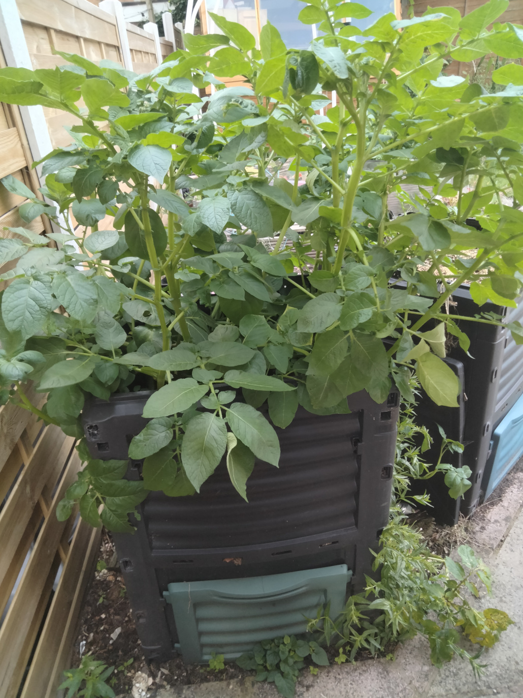 The spuds in my Tardis are so incredibly lush. So, you get a photo! The vegetation is almost blocking my path to the garden. I'm super chuffed and expecting a great yield.