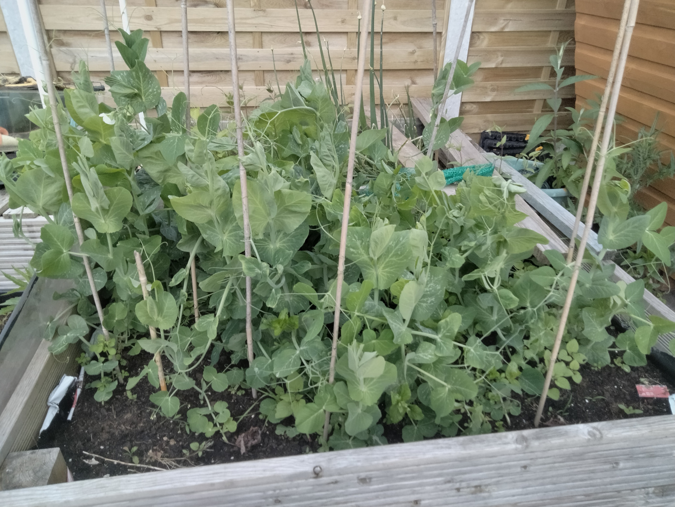 Meanwhile, I'm also seeing some life in the peas that I lobbed into one of my raised beds. Have a laugh at my shoddy gesture towards supporting them on canes