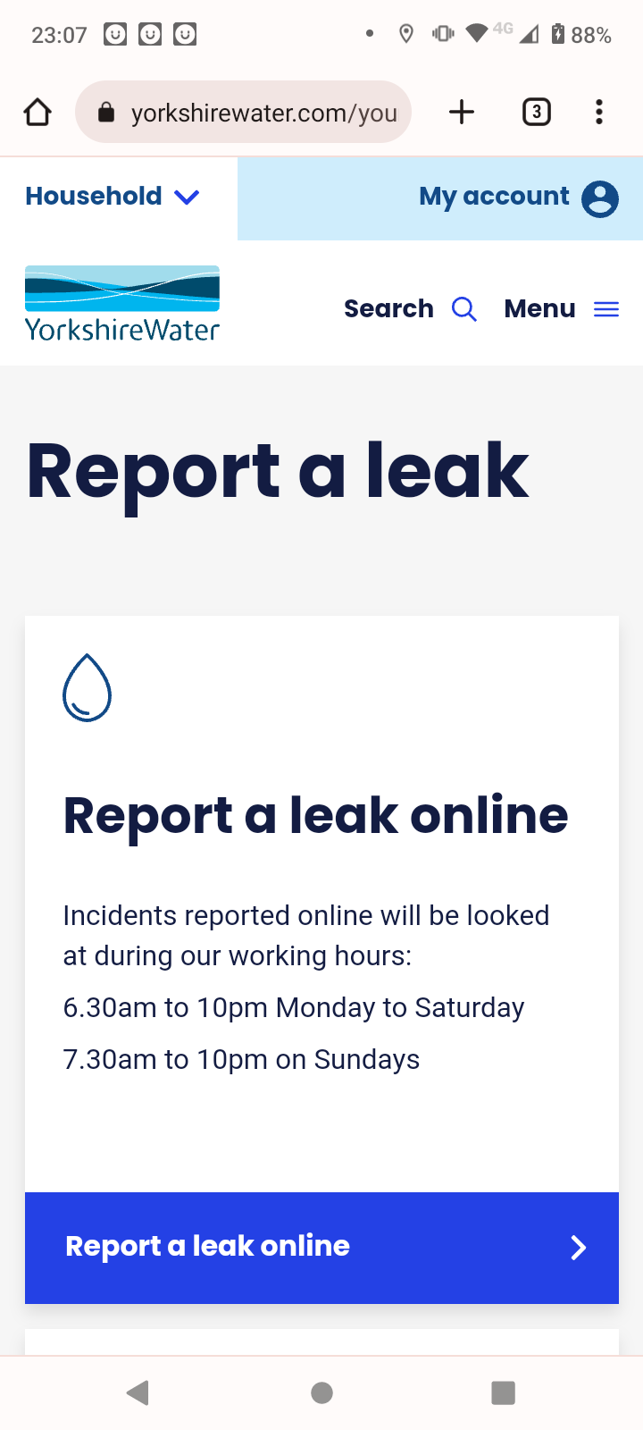 It's well worth adding the gas board emergency number UK: 0800111999 to your phone alongside electric board 105 ... As for Yorkshire water.... Last time I rung them they told me to do it on line well somewhere between the fire service and northern power grid strong words were had with YW :twisted: it was flooding round a substation and the number I had for leaks no longer works