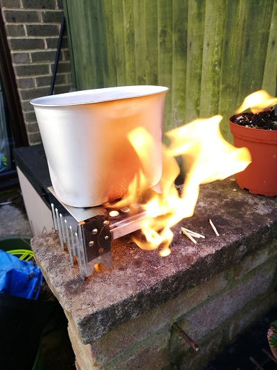 Yes it was somewhat windy that day and I had it perched on top of the brick BBQ wall but a good lesson to try stuff out so when I do need to use I won't accidentally set myself on fire! It heated half a cup of water to very warm in 4 minutes or so, for an instant sachet of all in one coffee n creamer to go in and I had a decent hot drink, which was the aim of the exercise. Good to keep in the back of the car and it takes up very little space/weight compared to gas canister camping stoves. For storage, the solid fuel sits inside the folded up stove and the stove with matches sit inside the cup with along some single use sachets of drink. All nice n compact, weighing very little.